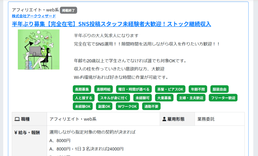 こちらはもう掲載が終了していますが、SNS投稿スタッフの求人。文字を書くことに抵抗がなければ結構な収入に。