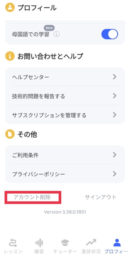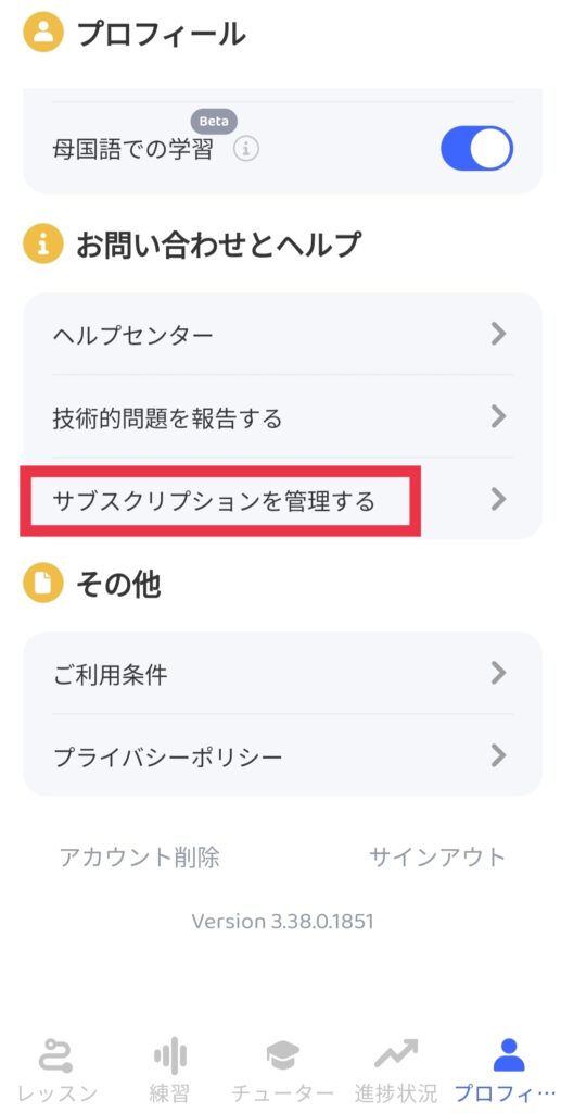 以前、duolingoを解約したときと同じようにアプリから入り、解約ページを探す。