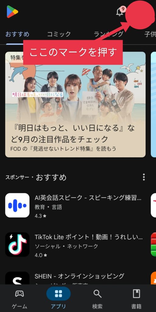 GooglePlayStoreを開いて右上のアイコンをタップ